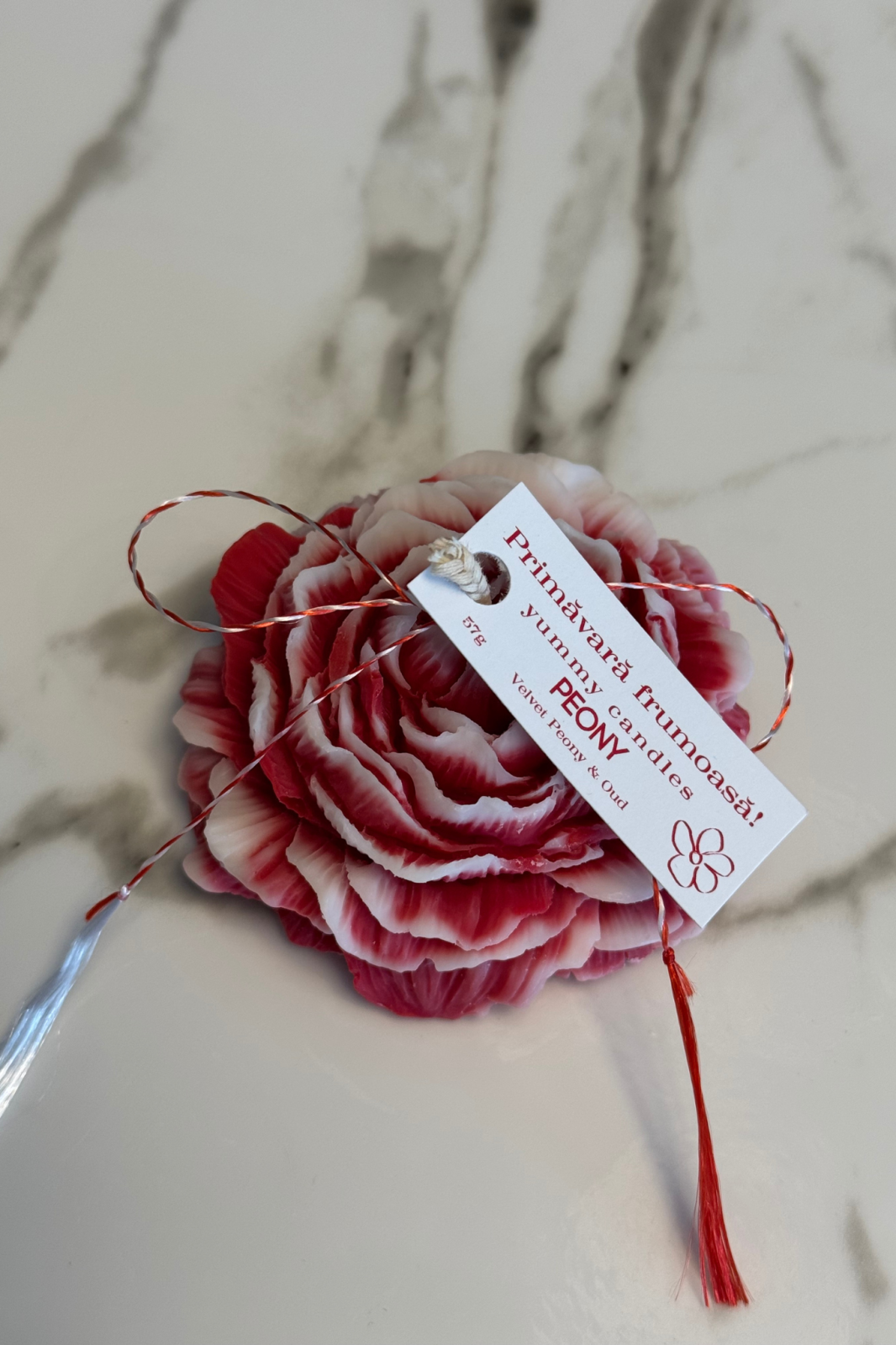Lumânarea Mărțișor Bujor este un simbol delicat al primăverii și al feminității. Turnată manual din ceară de soia, redă în detaliu forma unui bujor elegant, cu petale atent conturate, într-o compoziție decorativă rafinată. Parfumata Velvet Peony & Oud — o combinație sofisticată între floralul catifelat al bujorului și profunzimea caldă a oud-ului, rezultând o aromă elegantă, feminină și ușor misterioasă.